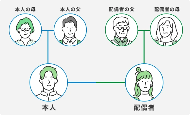 保険の対象となる方(被保険者)には、ビューカード会員さまだけでなく、その配偶者さまやそれぞれのお父さま、お母さまをご指定いただくことができます。